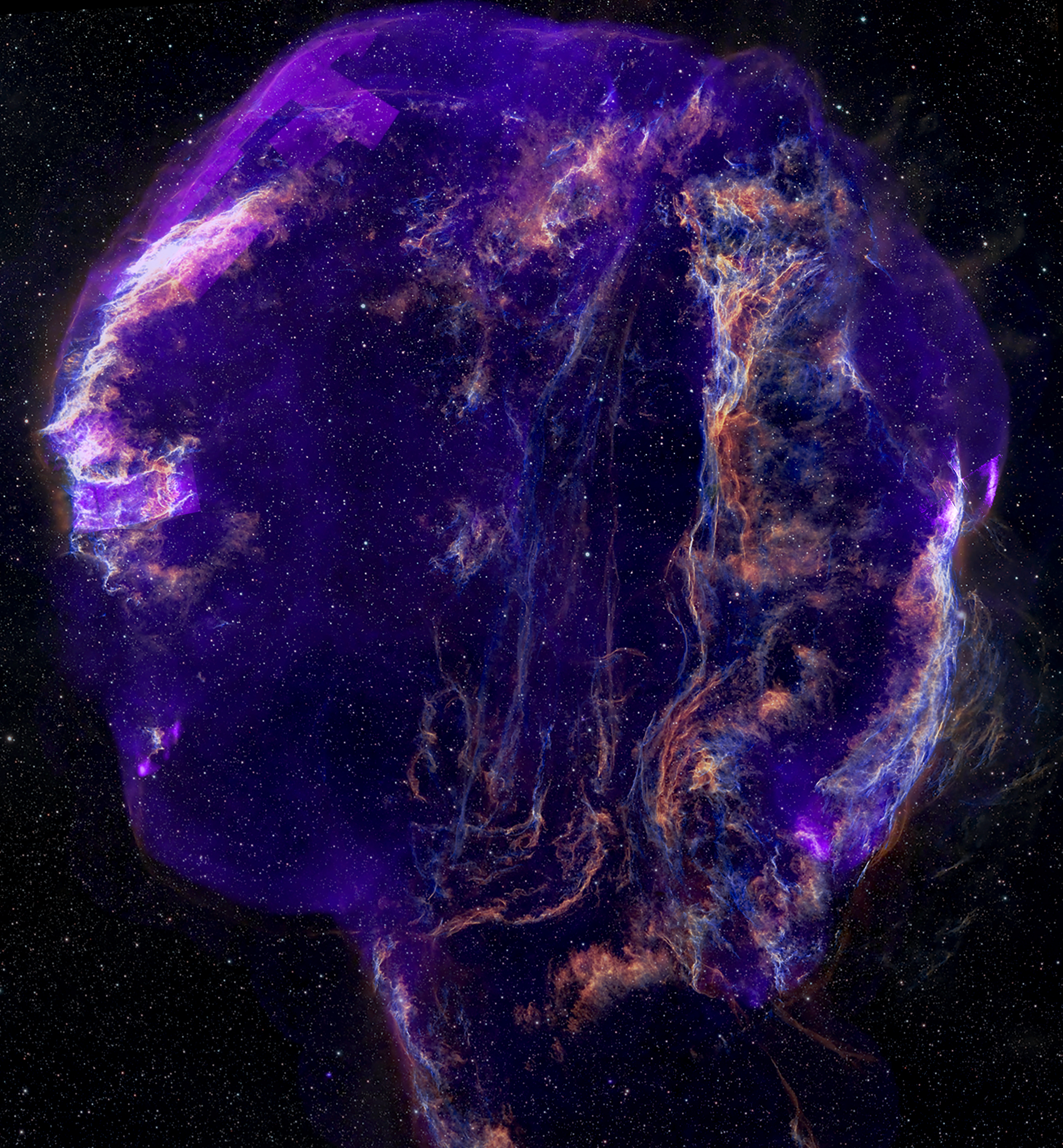 Close-ups of the Cygnus Loop’s lower right, middle right and upper left areas with optical data (orange, light blue, white) and X-ray data (violet-purple). Credit: X-ray: NASA/SAO/CXC; Optical: John Stone (Astrobin); Image Processing: NASA/SAO/CXC/L. Frattare, N. Wolk (NASA's Chandra Releases New 3D Models of Cosmic Objects)