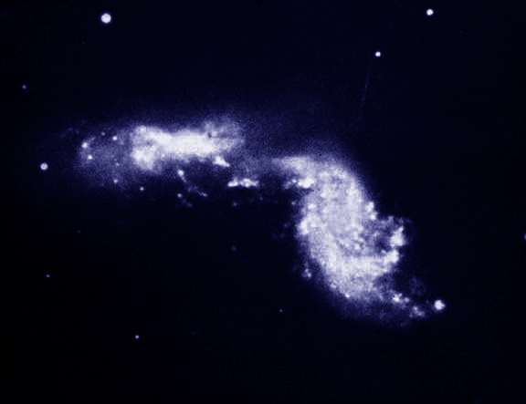 The hot spots (blue) located where the disks of the galaxies are colliding are thought to be due to the formation of hundreds of thousands of new stars as the two gaseous disks rotate through each other.