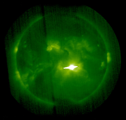 X-ray images captured by the GOES Solar X-ray Imager illustrate the difference in the Sun before and after a solar flare. The groundbreaking first observation of X-rays from Saturn's low-latitudes appeared as a direct response to this flare, at left, from a sunspot clearly visible from Saturn and Earth. This flare was classified as an M6. M-class flares are medium-sized, generally causing brief radio blackouts at Earth's polar regions. With nine subdivisions for X-ray flares, an M6 flare is more powerful than those ranked M1 through M5.