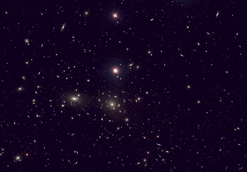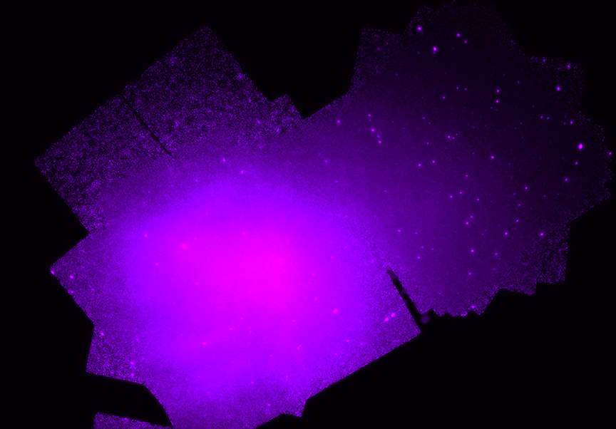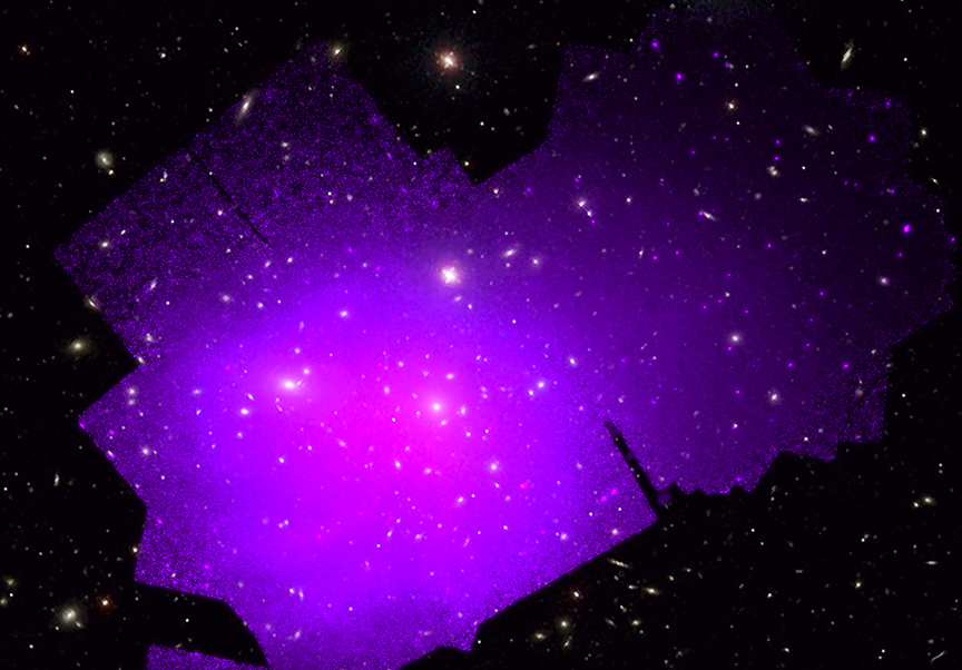 These images show a deep Chandra dataset of the Coma galaxy cluster, which researchers used to study how the hot gas in the cluster behaves. They found the hot gas in Coma was less "sticky," or had lower viscosity, than expected. X-rays from Chandra are show with an optical image from the Sloan Digital Sky Survey (white). The low viscosity may be caused by tiny irregularities in the galaxy cluster's magnetic fields reducing the distance that particles can move freely. .