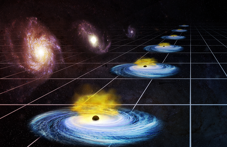 A study using Chandra, XMM-Newton and Sloan Digital Sky Survey (SDSS) data suggests that dark energy may have varied over cosmic time. This artist's illustration helps explain how astronomers tracked the effects of dark energy to about one billion years after the Big Bang by determining the distances to nearly 1,600 quasars, rapidly growing black holes that shine extremely brightly.