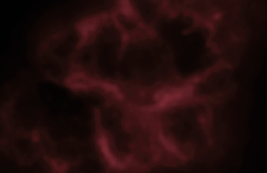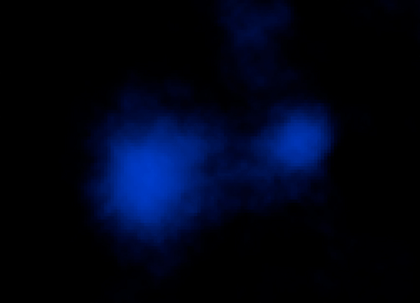 This image of the Bullet Cluster (officially known as 1E 0657-56) provided the first direct proof of dark matter, the mysterious unseen substance that makes up the vast majority of matter in the Universe. X-rays from Chandra (pink) show where the hot gas in two merging galaxy clusters has been wrenched away from dark matter, seen through a process known as "gravitational lensing" in data from Hubble (blue) and ground-based telescopes. In converting this into sound, the data pan left to right, and each layer of data was limited to a specific frequency range. Data showing dark matter are represented by the lowest frequencies, while X-rays are assigned to the highest frequencies. The galaxies in the image revealed by Hubble data, many of which are in the cluster, are in mid-range frequencies. Then, within each layer, the pitch is set to increase from the bottom of the image to the top so that objects towards the top produce higher tones.