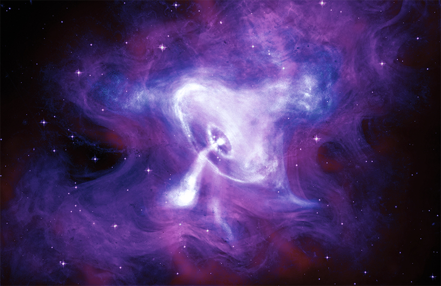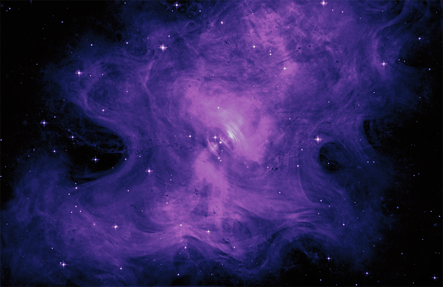 The Crab Nebula has been studied by people since it first appeared in Earth's sky in 1054 A.D. Modern telescopes have captured its enduring engine powered by a quickly spinning neutron star that formed when a massive star collapsed. The combination of rapid rotation and a strong magnetic field generates jets of matter and anti-matter flowing away from its poles, and winds outward from its equator. For the translation of these data into sound, which also pans left to right, each wavelength of light has been paired with a different family of instruments. X-rays from Chandra (blue and white) are brass, optical light data from Hubble (purple) are strings, and infrared data from Spitzer (pink) can be heard in the woodwinds. In each case, light received towards the top of the image is played as higher pitched notes and brighter light is played louder.