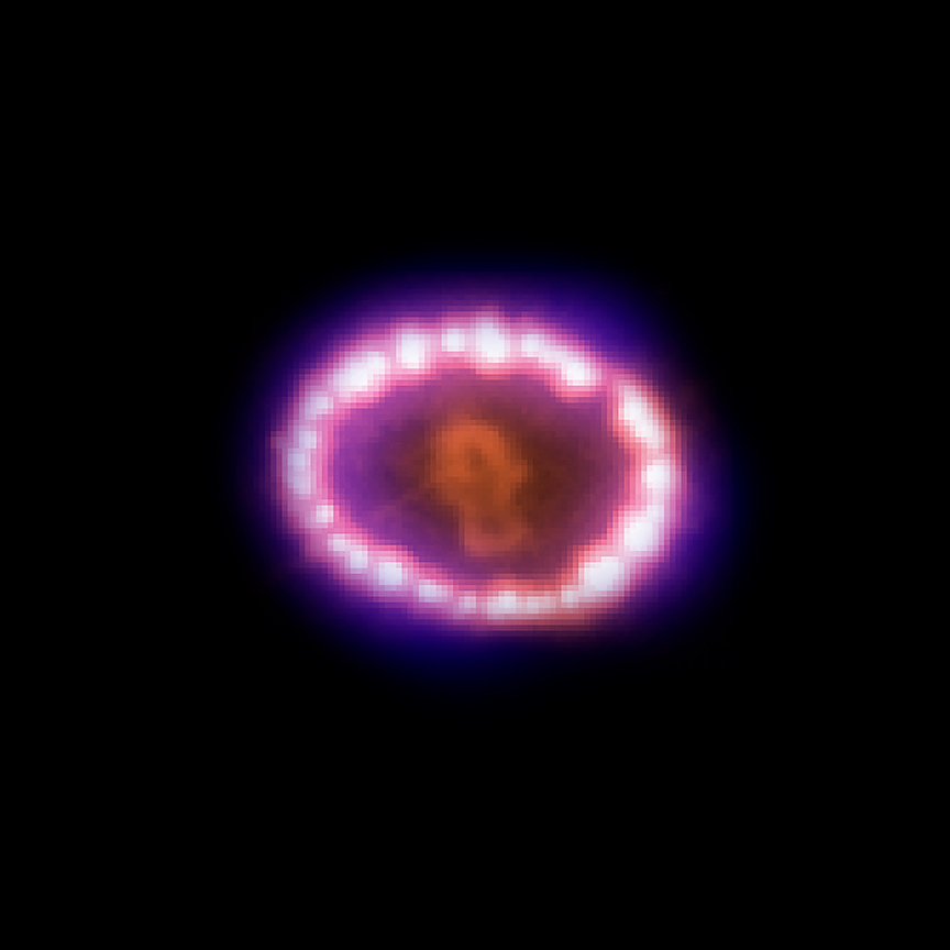 On February 24, 1987, observers in the southern hemisphere saw a new object in the Large Magellanic Cloud, a small satellite galaxy to the Milky Way. This was one of the brightest supernova explosions in centuries and soon became known as Supernova 1987A (SN 87A). This time lapse shows a series of Chandra (blue) and Hubble (orange and red) observations taken between 1999 and 2013. This shows a dense ring of gas, which was ejected by the star before it went supernova, begins to glow brighter as the supernova shockwave passes through. As the focus sweeps around the image, the data are converted into the sound of a crystal singing bowl, with brighter light being heard as higher and louder notes. The optical data are converted to a higher range of notes than the X-ray data so both wavelengths of light can be heard simultaneously.